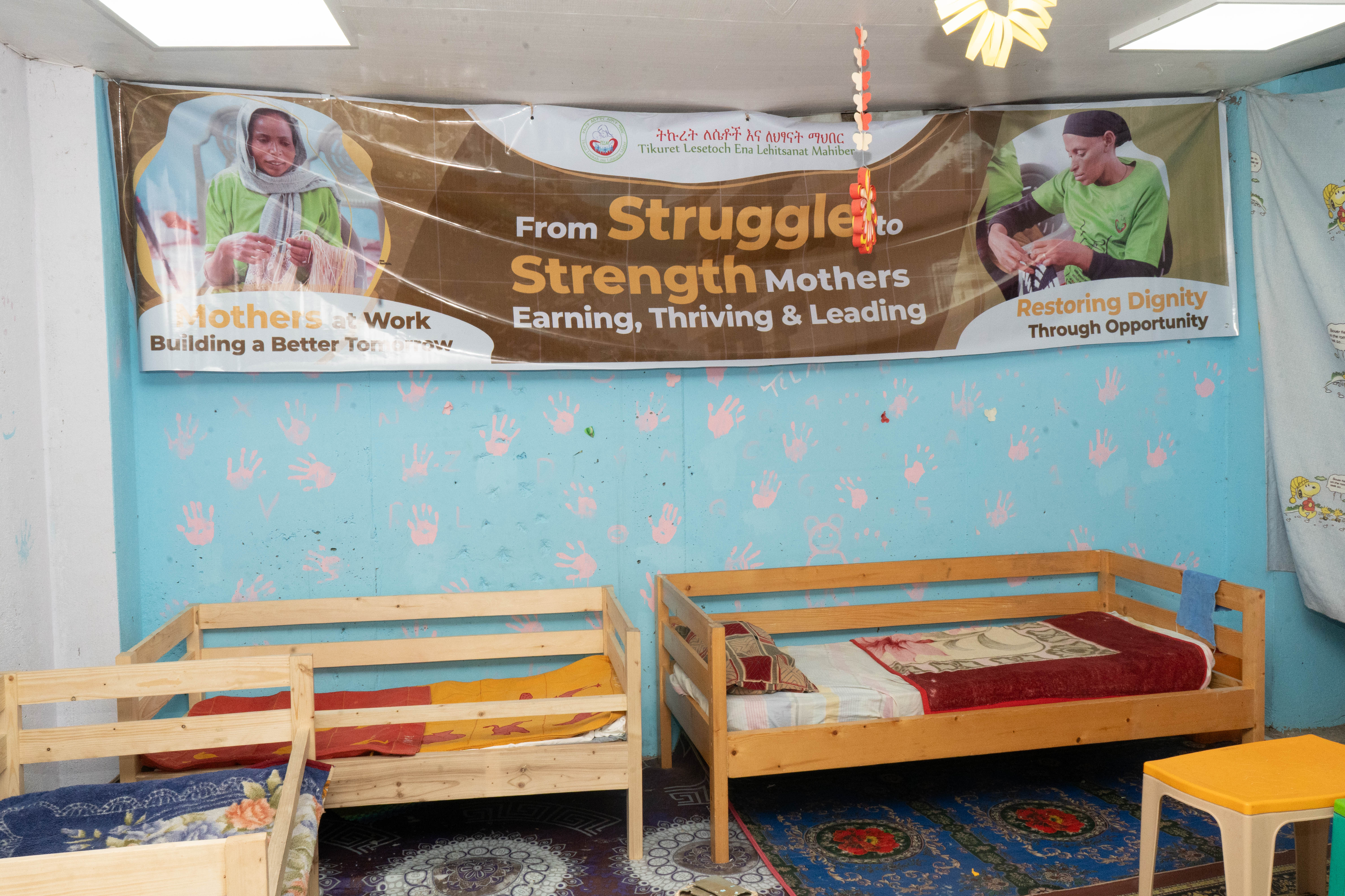 Inside the center, children receive structured daily support in a safe and dignified environment, while mothers participate in vocational work that generates real income for their families.